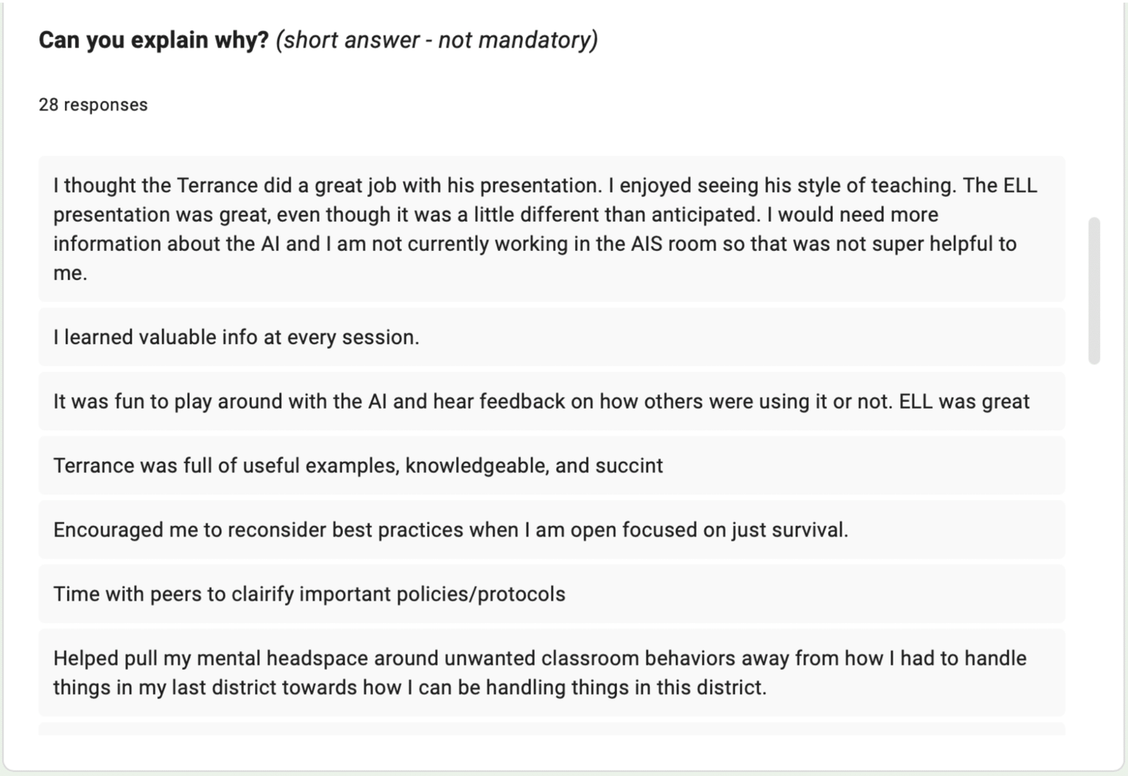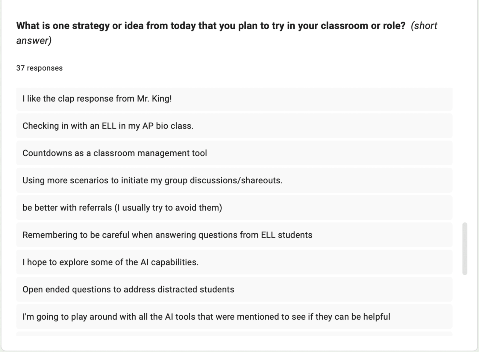 The Exit ticket results are a product of a PD I composed focused on shifting how teachers handle discipline. I wanted to highlight the intentional move needed in the culture of the school from just writing referrals and removing students, to really understanding what’s driving the behavior and working to repair harm and rebuild relationships.